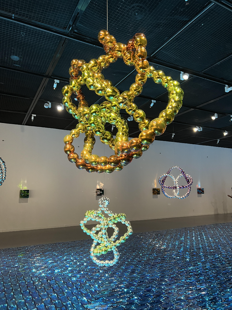 유리는 변형이 자유롭고, 액체에서 고체로 변화하기도 하는 등 많은 특징을 가지고 있지만, 특히 유리의 연약함에 이끌렸다고 합니다. 멀리서 보기에 유리구슬은 매우 화려하지만, 가까이에서 보면 표면에 수많은 작은 기포들과 스크레치를 발견할 수 있으며 완벽하지 않음을 알 수 있다고 합니다. 이를 통해 우리 주변의 많은 상처를 표현하기에 완벽한 재료라고 생각했다고 합니다.