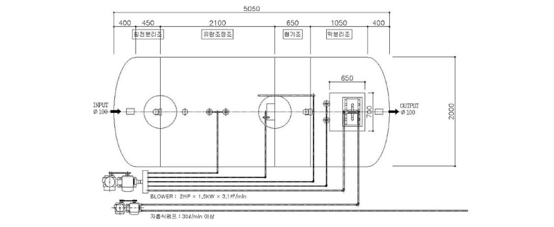 - 유입된 오수는 침전분조에서 고형물을 제거한 다음 유량조정조로 투입됨.