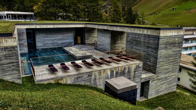 미네랄워터 발저의 생산지로 유명한 산골 마을 팔츠에 지은 온천입니다. 춤토르는 팔츠에서 지붕에 쓰는 편마암을 켜로 쌓도록 설계했습니다. 테르메 발스는 완공된 지 2년 만에 세계적으로 유명해졌고 인구 1,000명의 소도시인 팔츠가 유명 휴양지가 되는 데 큰 공헌을 했습니다.