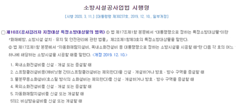 - 소방시설공사업법 시행령(하단 참조) → 제10조(공사감리자 지정대상 범위)에 해당되어 소방감리 대상.