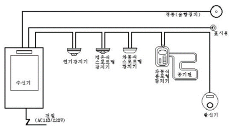 - 화재시 : 감지기 → 수신기 → 발신기(소방벨), 방송설비, 시각경보기 등으로 신호가 전달되어 화재 경보됨.